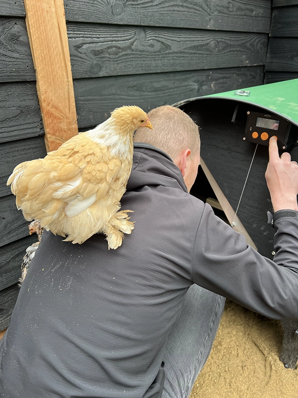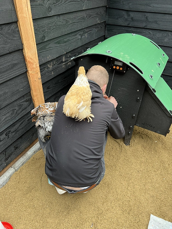 Vanochtend moesten ze wel even wennen aan hun nieuwe ren, maar inmiddels zijn ze er al best aan gewend! Gisteravond hadden we geen tijd meer om het automatische-deur-sluit-systeem (😂) te installeren, dus dat deden we vanochtend. Samen met de kippen. Vooral Fluffy heeft even goed meegekeken hoe het werkt. We hebben nu ingesteld dat hij om 07:00 open gaat en om 20:30 dicht, maar geen idee of dat zo goed werkt. De tijd zal het leren, ze moeten er natuurlijk ook nog helemaal aan wennen.