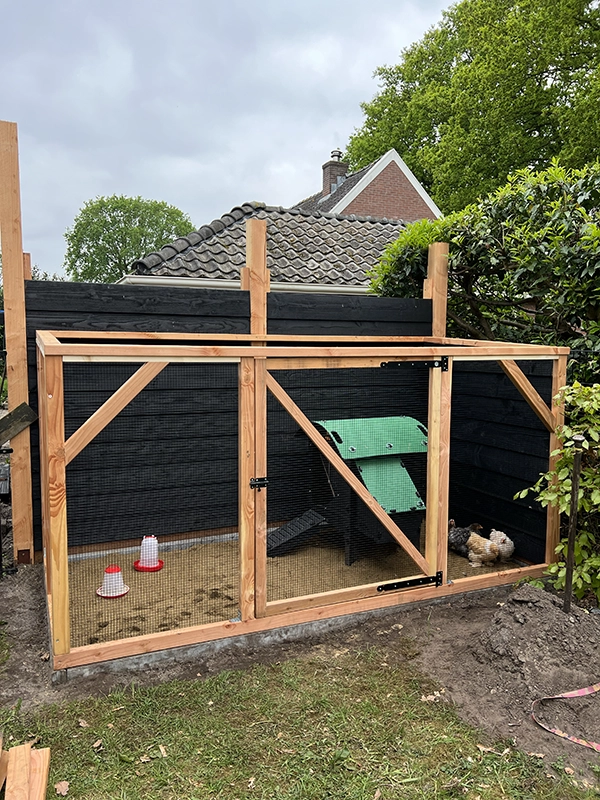 Afgelopen week hebben we samen heel hard gewerkt aan de nieuwe kippenren en hij staat! We hebben ervoor gekozen om zelf een ren te bouwen, waar we ons kunststof Nestera hok in konden zetten. Het is nog niet helemaal af, we moeten de dakbedekking nog doen (nu een tijdelijke oplossing) en het moet nog aangekleed en ingericht worden. Maar de kippen zijn alvast in hun nieuwe verblijf gaan wonen. Yes! Ze zijn heel gezellig en lief hoor, maar het was niet zo grappig meer in huis. Ze maken een dikke bende (schoppen alles uit de kooi) en ze stínken. We konden nog zo vaak het hok schoonmaken, maar het was niet te doen. Dus we zijn heel blij dat ze nu uit huis zijn. 😂