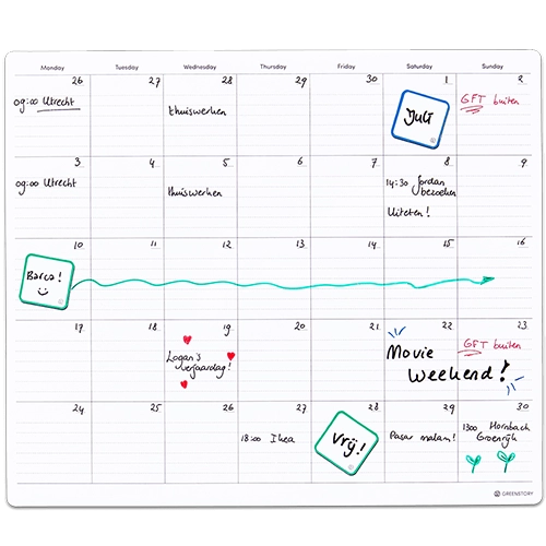 Toen onze nieuwe keuken af was, wilde ik ook echt een maandplanner of familieplanner. Zodat we allemaal goed overzicht hebben van wanneer we iets hebben. Ik wilde alleen geen spijkertje in de nieuwe keuken of een schroef in 1 van de muren o.i.d. Toen kwam ik deze sticky whiteboard planners tegen van GreenStory. Nou, dat klonk perfect! Dus ik heb een maandplanner besteld.