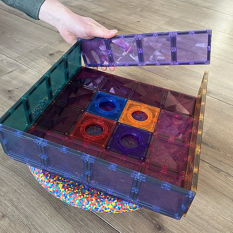 Je kunt het steeds een beetje moeilijker maken. Je kunt regels maken dat de balletjes in de juiste kleur moeten komen, of er een doolhof in maken of nog een extra verdieping erbovenop. Super leuk en eindeloze mogelijkheden en speelplezier!