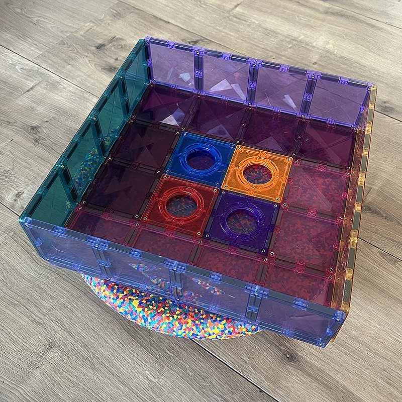 Je kunt het op een hele makkelijke, stevige en snelle manier maken als je bepaalde pakketten hebt van Connetix. Maar je kunt het ook iets ‘omslachtiger’ maken met het gewone Connetix pakket, met losse tegels. Het is dan alleen wat minder stevig, maar als je het op het balansbord van Stapelstein doet, maakt dat niet zoveel uit. Je kunt het dus op meerdere manieren bouwen.