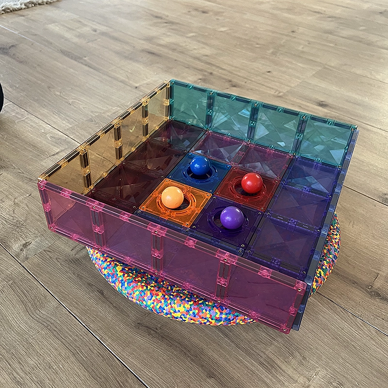 Wij hadden hem eerst gebouwd met de kwart cirkels van het Shapes Expansion Pack. Maar dan moet je het spel heel goed vasthouden en kun je hem niet even neerzetten want dan is het geheel te zwaar en zakt het ‘balans’-stukje onder het bord in. Later hebben we het spel op het balansbord van Stapelstein gelegd, dat werkte net zo goed en toen was het super stevig! Nog veel handiger dus.