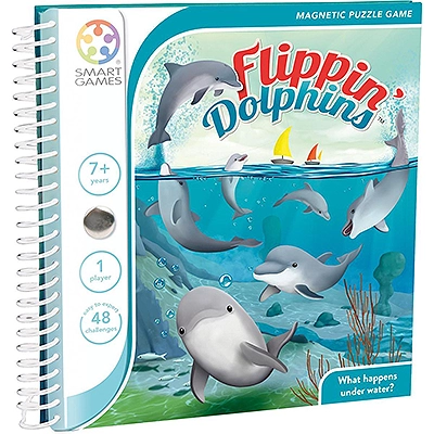 Dolfijnen zijn speelse en intelligente dieren… maar je kan ze enkel zien wanneer ze uit het water springen. Kan jij ook uitzoeken wat ze onderwater allemaal doen? Duik in dit “dol-fijn” puzzelspel met 7 magnetische puzzelstukken en 48 opdrachten van makkelijk tot razend moeilijk.